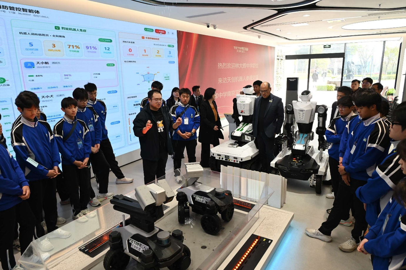 在現今人工智能技術加速發展的時代背景下,學校特別安排了參觀雨花台區「人工智能生態街區」及「天創機器人」——南京天創電子技術有限公司。同學們深深感受到科技與產業的融合力量,並備受啟發。這次參觀讓學生們了解到AI在城市應用、智慧交通與產業協同中的廣泛可能性,進一步激發他們學習新技術的熱情和好奇心。