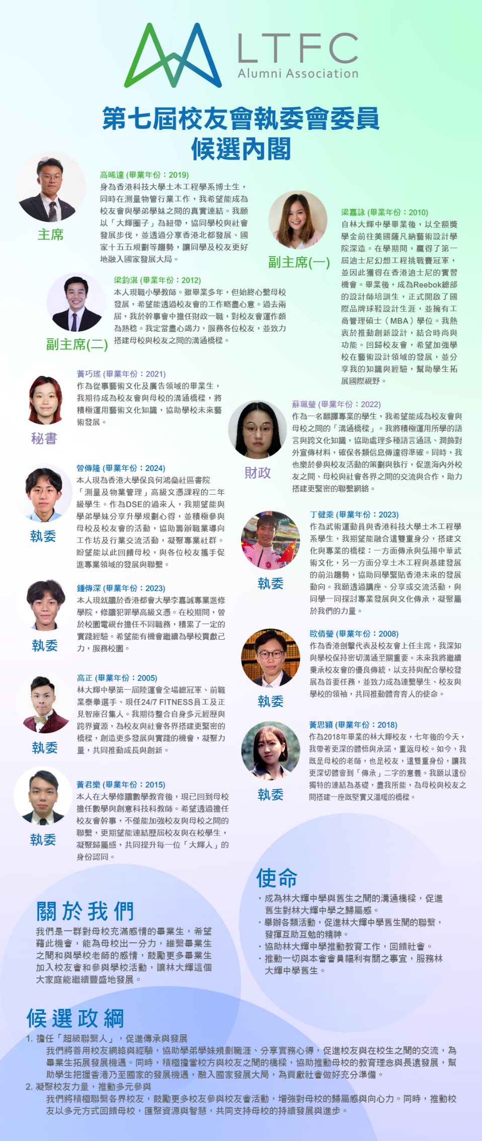 林大輝中學(下稱「本校」)校友會周年會員大會暨第七屆執委會選舉謹定於2026年1月30日(星期五) 晚上7:00-7:30以實體形式在學校舉行。議程包括會務報告、財政報告及校友會第七屆執行委員會委員選舉。敬請各位校友撥冗出席,參與支持。本校校友會第七屆執行委員會委員選舉,提名期已於2025年12月30日結束。校友會在提名期內共接獲1份完整候選內閣提名資料。
